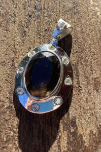 Da der große Stein m. E. ein wenig Betonung und einen sicheren Halt benötigte, damit er nicht beim Tragen kippt, habe ich mich für eine Umrandung aus Silber mit eingeriebenen Zirkonia im Billiantschliff entschieden. Zusätzlich hat die Aufhängung einen Stein erhalten.
