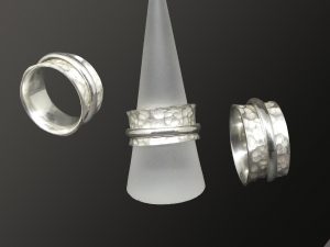 Der Hauptring ist texturiert und geweißt. Anschließend wurden nur die erhabenen Kanten poliert. Um diesen Ring läuft ein lockeres, komplett poliertes Silberband, das sich einfach drehen läßt.