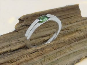 Erstes Stück ist ein schmaler Ring mit einem kleinen ovalen Turmalin in sattem Grün. Ich habe mal versucht, den Stein etwas ungewöhnlich zu fassen, so dass die Ringschiene und der Stein eine sich ergänzende und glatte Form ergeben.